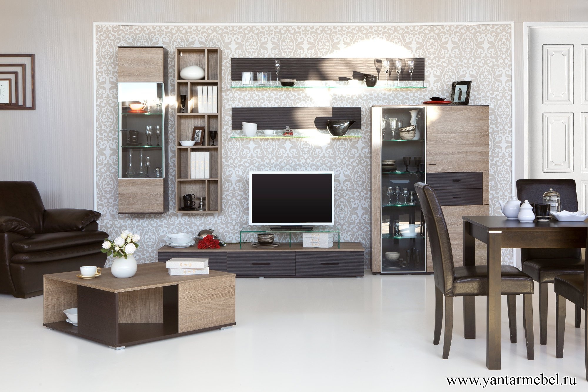 Отличный вариант для оформления любой гостиной. Наличие большого количества различных шкафов придают этой модели стенки многофункциональность и комфортность.