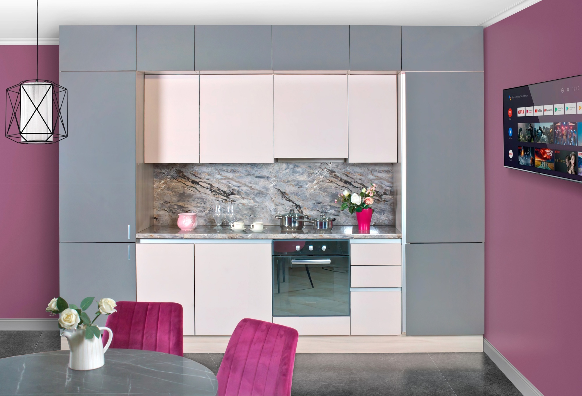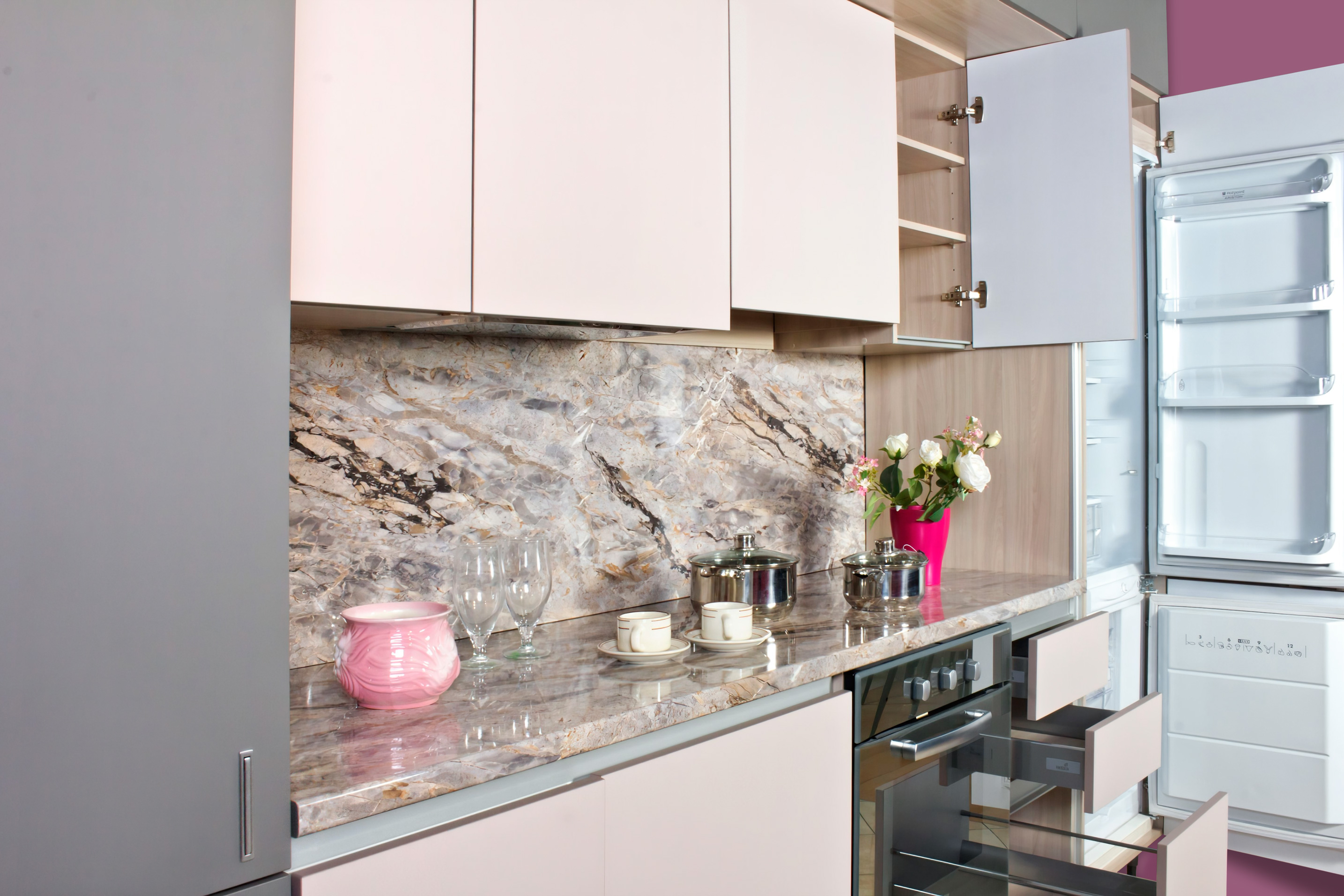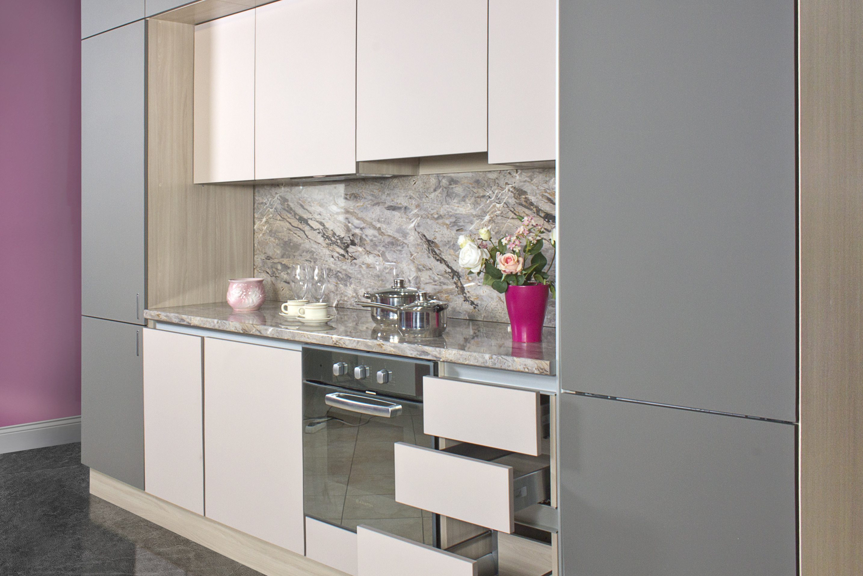 Фасады выполнены из высококачественного МДФ, покрытые матовой пленкой, корпус ЛДСП. Встроенные холодильник и посудомоечная машина. Вместо стандартных ручек используются итальянские врезные ручки-профили Gola.