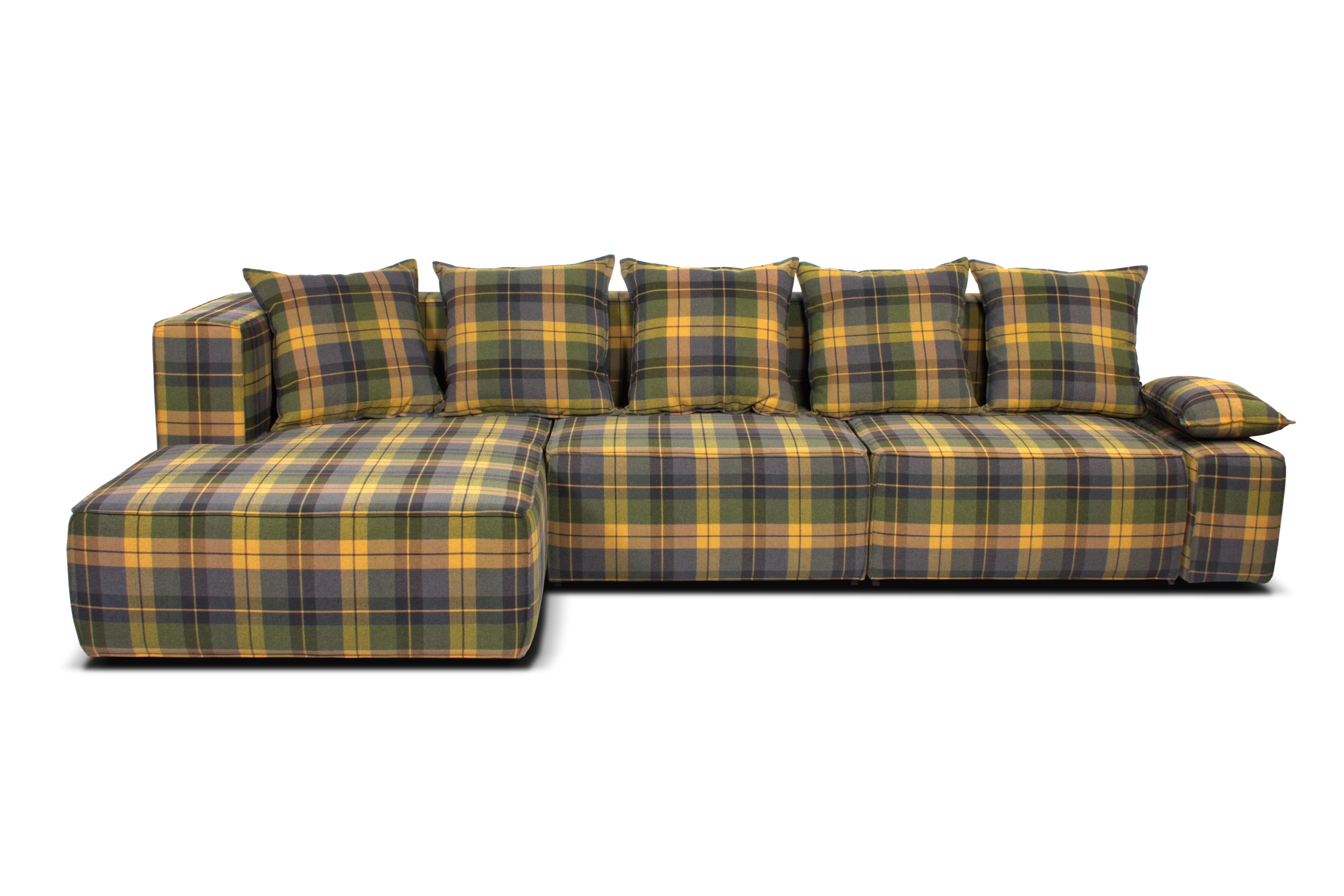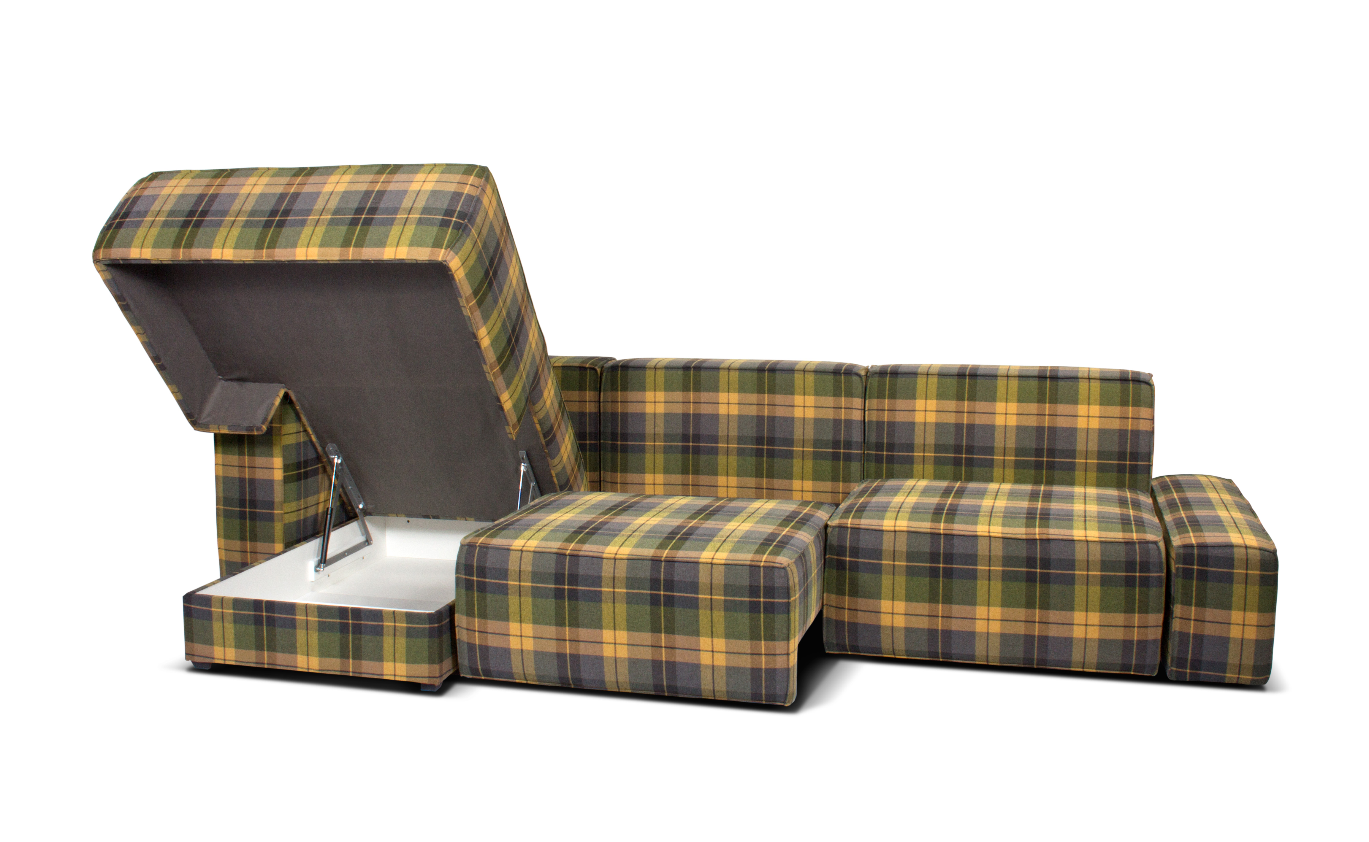 Каркас изготовлен из древесины хвойных пород, ДВП, ЛДСП. Диван устанавливается на стационарные опоры высотой 35 мм. Мягкие элементы сформированы на основе блока независимых пружин, эластичного пенополиуретана, иглопробивного и синтетического полотна общей высотой 140 мм. Основание мягких элементов – эластичное (ремни). Оттоманка и кресло имеют нишу для постельных принадлежностей.